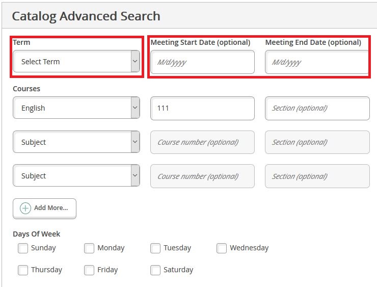 - Select either the "Term" from the drop-down menu or enter "Meeting Start" and "End Dates" for the course (this is useful to search for class availability after a term has started).